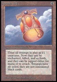 | Campana di Kormus Edizione: Revised Bordo Nero Rarita': NC Colore: ARTEFATTO Costo di lancio: 4 Tipo: Artefatto Forza / Costituzione: n/a Testo: Tutte le paludi sono creature 1/1 che contano ancora come terre. [Oracle 2002/03/01]
