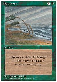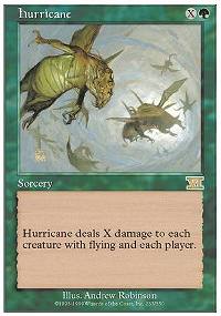 | Uragano Edizione: Settima Edizione Rarita': R Colore: VERDE Costo di lancio: X Tipo: Stregoneria Forza / Costituzione: n/a Testo: L'Uragano infligge X danni a ogni creatura con volare e a ogni giocatore.
