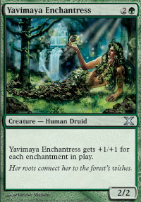 | Incantatrice di Yavimaya Edizione: Settima Edizione Rarita': NC Colore: VERDE Costo di lancio: 2 Tipo: Creatura - Druido Forza / Costituzione: 2/2 Testo: L'Incantatrice di Yavimaya prende +1/+1 per ogni incantesimo in gioco.