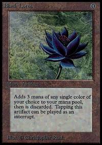 | Loto Nero Edizione: Alpha Rarita': R Colore: ARTEFATTO Costo di lancio: 0 Tipo: Artefatto Forza / Costituzione: n/a Testo: {TAP}, Sacrifica il Loto Nero: Aggiungi tre mana di un qualsiasi singolo colore alla tua riserva di mana. [Oracle 2001/08/24]