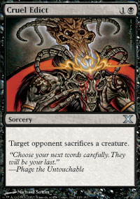| Editto Crudele Edizione: 10^ edizione Rarita': NC Colore: NERO Costo di lancio: 1 Tipo: Stregoneria Forza / Costituzione: n/a Testo: Un avversario bersaglio sacrifica una creatura.