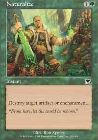 | Ritorno alla Natura Edizione: 10^ edizione Rarita': C Colore: VERDE Costo di lancio: 1 Tipo: Istantaneo Forza / Costituzione: n/a Testo: Distruggi un artefatto o un incantesimo bersaglio.