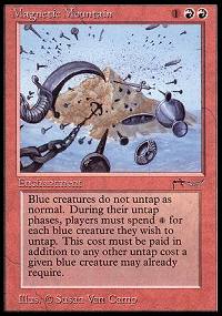 | Montagna Magnetica Edizione: Arabian Nights Rarita': NC Colore: ROSSO Costo di lancio: 1  Tipo: Incantesimo Forza / Costituzione: n/a Testo: Le creature blu non STAPpano durante lo STAP dei loro controllori. ; Le creature blu hanno "{4}: STAPpa questa creatura. Gioca questa abilità solo durante il tuo mantenimento." [Oracle 2001/08/24]