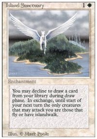| Isola Santuario Edizione: Quinta Edizione Rarita': R Colore: BIANCO Costo di lancio: 1 Tipo: Incantesimo Forza / Costituzione: n/a Testo: Se peschi una carta durante la tua acquisizione, invece puoi saltare quella pescata. Se lo fai, fino all'inizio del tuo prossimo turno possono attaccarti soltanto le creature con volare o con passa-isole. [Oracle 2000/10/24]
