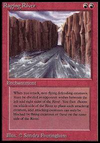 | Fiume Tumultuoso Edizione: Unlimited Rarita': R Colore: ROSSO Costo di lancio:   Tipo: Incantesimo Forza / Costituzione: n/a Testo: All'inizio della tua fase di combattimento, ogni avversario sceglie "est" o "ovest" per ciascuna creatura senza volare che controlla. ; Mentre dichiari le creature attaccanti, scegli "est" o "ovest" per ciascuna creatura attaccante. ; Le creature "est" non possono bloccare le creature "ovest". Le creature "ovest" non possono bloccare le creature "est". [Oracle 2003/02/01]