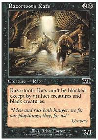 | Ratti dai Denti di Rasoio Edizione: Sesta Edizione Rarita': C Colore: NERO Costo di lancio: 2 Tipo: Creatura - Ratto Forza / Costituzione: 2/1 Testo: Paura (Questa creatura non può essere bloccata tranne che da creature artefatto e/o da creature nere.) [Oracle 2002/10/01]
