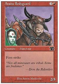 | Guardia del Corpo di Anaba Edizione: Sesta Edizione Rarita': C Colore: ROSSO Costo di lancio: 3 Tipo: Creatura - Minotauro Forza / Costituzione: 2/3 Testo: Attacco improvviso.